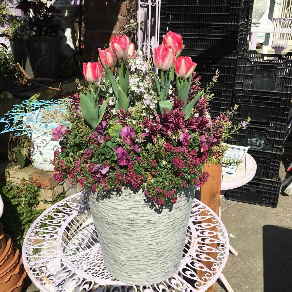 絡ませるのが難しくてどうしても普通の寄植えになってしまう私から見ると、親近感の感じられる一鉢です。