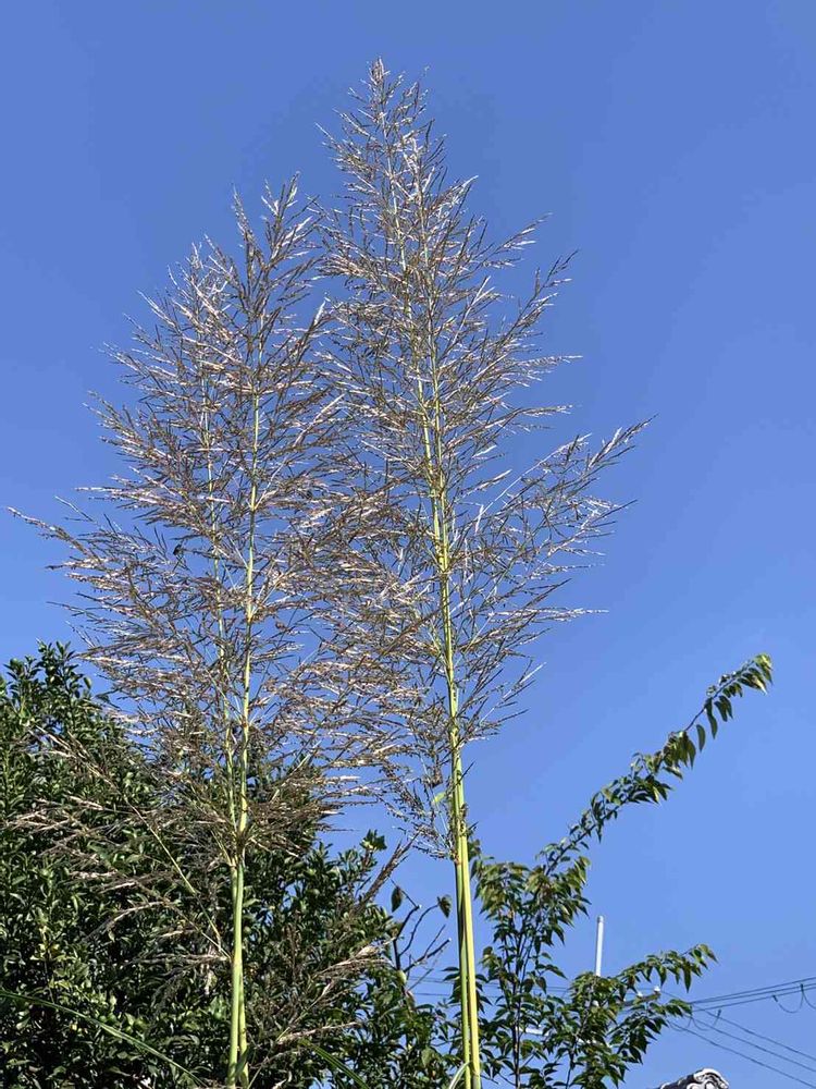 ススキさん🤗庭のススキさんがすごーく大きくなりました。秋晴れの青空に向かってのびのびとお日様の光をあびて幸せそうです。😁だけど植えた時には紫ススキさんだったんだけどー、美白した?