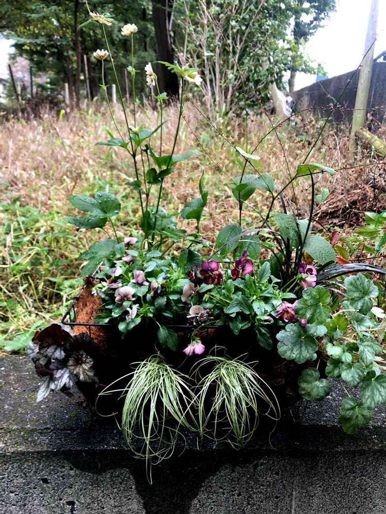 秋の寄せ植え。プランターはダイソーのワイヤーカゴにヤシシートを敷いたもの。