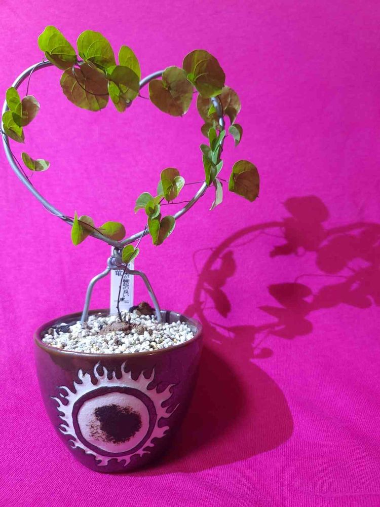 ハート支柱にハートの葉っぱを巻き付けた可愛らしい亀甲竜にはピンクバックで💟
