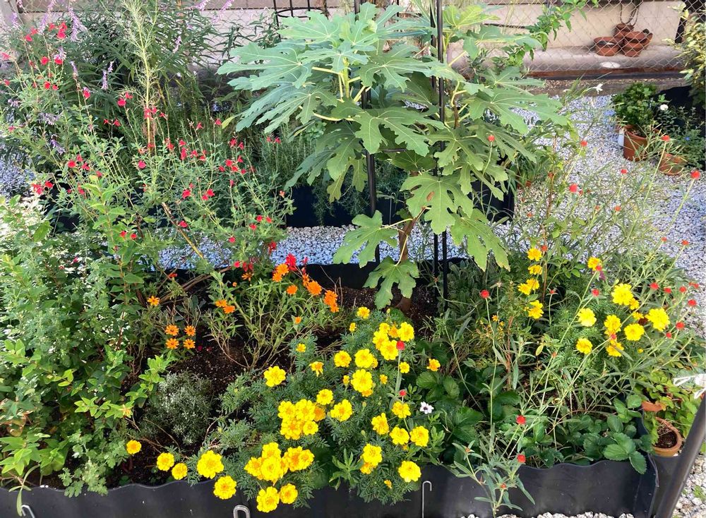 手前の花壇です🎵マリーゴールドが満開✨の、後ろに行灯に巻いたイチヂクちゃん❤️も随分大きくなっています✨✨✨