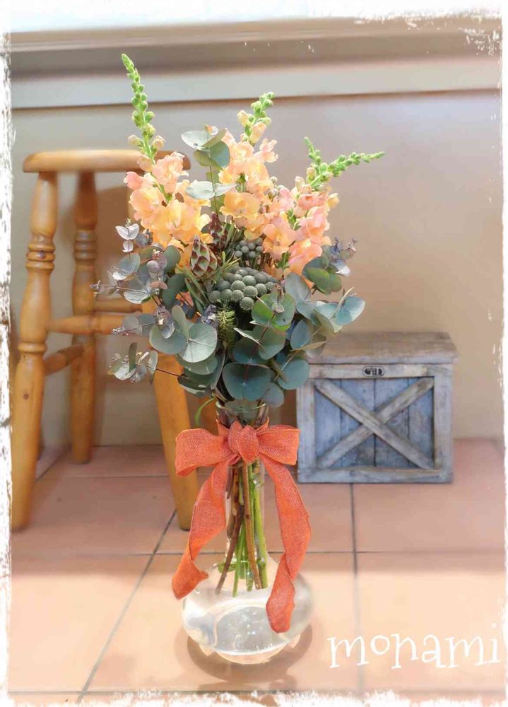 金魚草の淡いオレンジとリボンの濃いオレンジの間にプラチナリーフ✨✨✨ 意識してなかったかもしれませんが絶妙なカラーバランスです(*˘︶˘*).。.:*♡