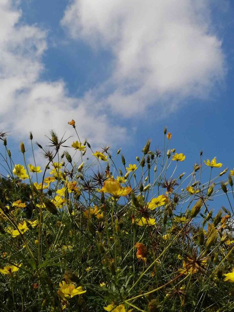 レモンブライトとひっつき虫と青空の競演‥黄色コスモスはもう見頃過ぎてる感じでしたがひっつき虫と共に青空に向かって伸びてる様は気持ちの良い風景でした✌