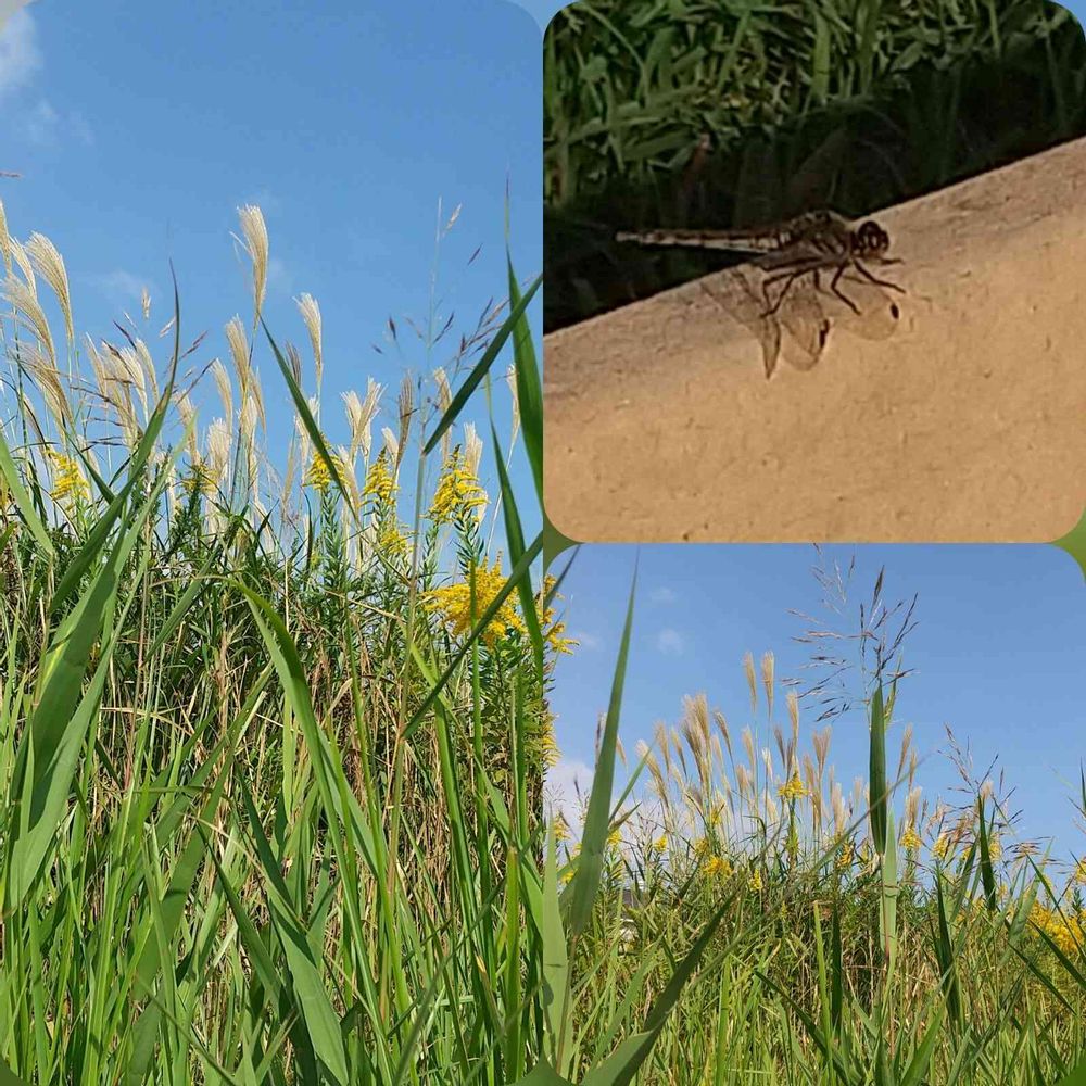 ススキ、セイタカアワダチソウ、赤トンボ、と青空🧡