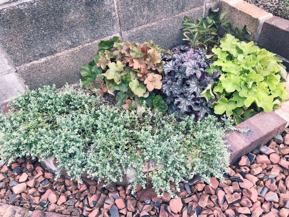 植えた時はオレンジ色がきれいだったヒューケラさんの色が、緑になってきました😳