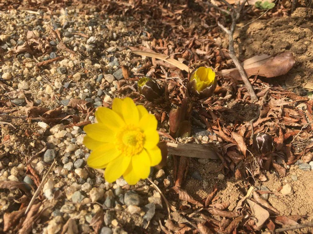 まだまた朝晩は寒く地面は固く凍ってたり霜柱が立ってるのですが陽のあたる場所から黄色い花が顔を覗かせています。