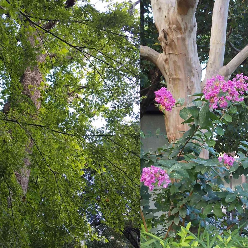 モミジは青々とし、サルスベリがまだ咲いていました。