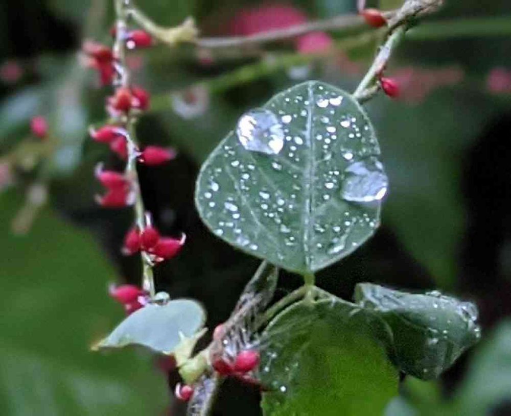 すっかりお花の終わったアプローチの藪豆の葉が雨粒のお目々でおはよう!と言ってくれましたよ…。水引も赤が目立ってきれいです。