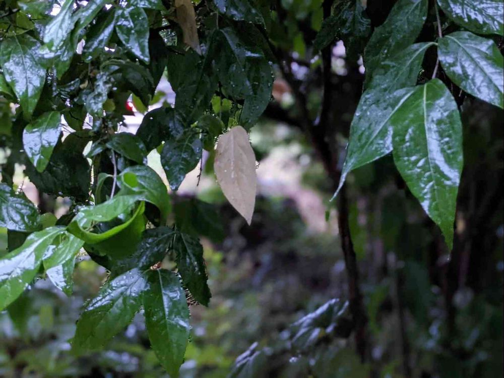 アプローチの蝋梅が濡れてツヤツヤときれい。少しづつ黄葉が見えて来ましたよ…。