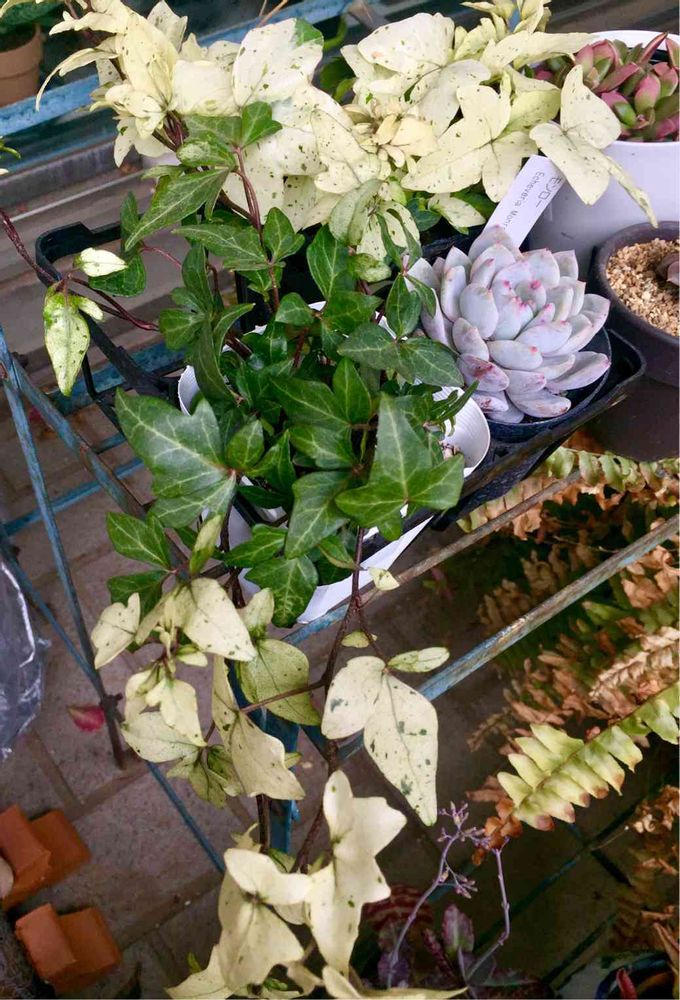白いヘデラに憧れて調べて年末にお迎えした奥のが’白雪姫’、手前のが’雪の華’です。