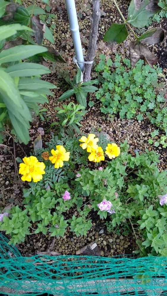 八重咲きのペチュニアの上が黄色のマリーゴールドその上の緑のホソバがそりかえってるやつはセキチクかダイアンサスでしょうかの投稿画像