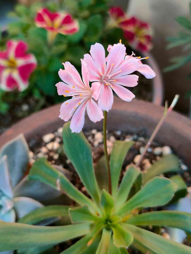和風ティストの花にみえるレウィシア、可憐で、可愛い。