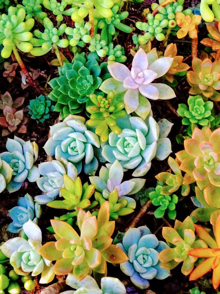 夕暮れ時の 南側地植え花壇の 多肉ちゃん達😻💚💗🤍💛