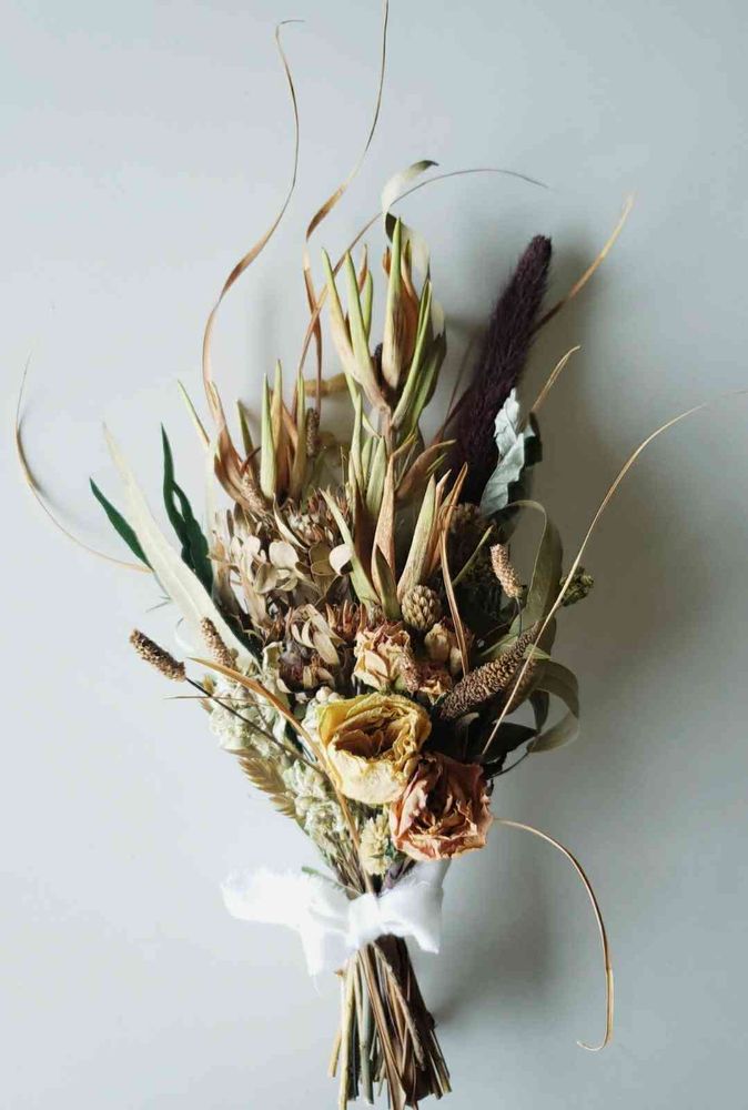 退色が進んだ花材と、ナチュラルな色合いの花材を束ねたスワッグ、ブーケ