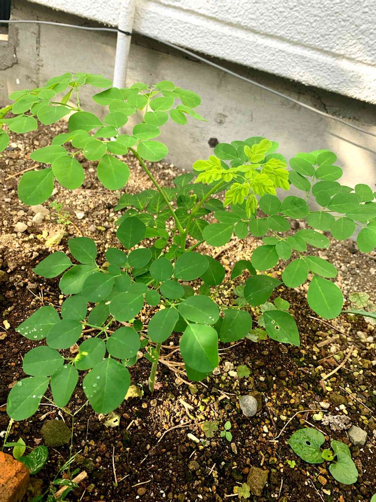 モリンガ栽培、2回失敗して、3度目の正直。今回はキッチン下の東側に地植え、ほかに2ヶ所、ポット1苗。これはキッチン下です。風があまり当たらないからか、よく育ってます〜冬はどうしよう😅