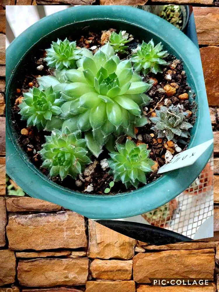 「メラニー」の親子を植え替えました。その後の姿です。親株が、中央で子供たちを回りに囲みました。やっと根がついて来たようです。一個だけ色味が違って居るので