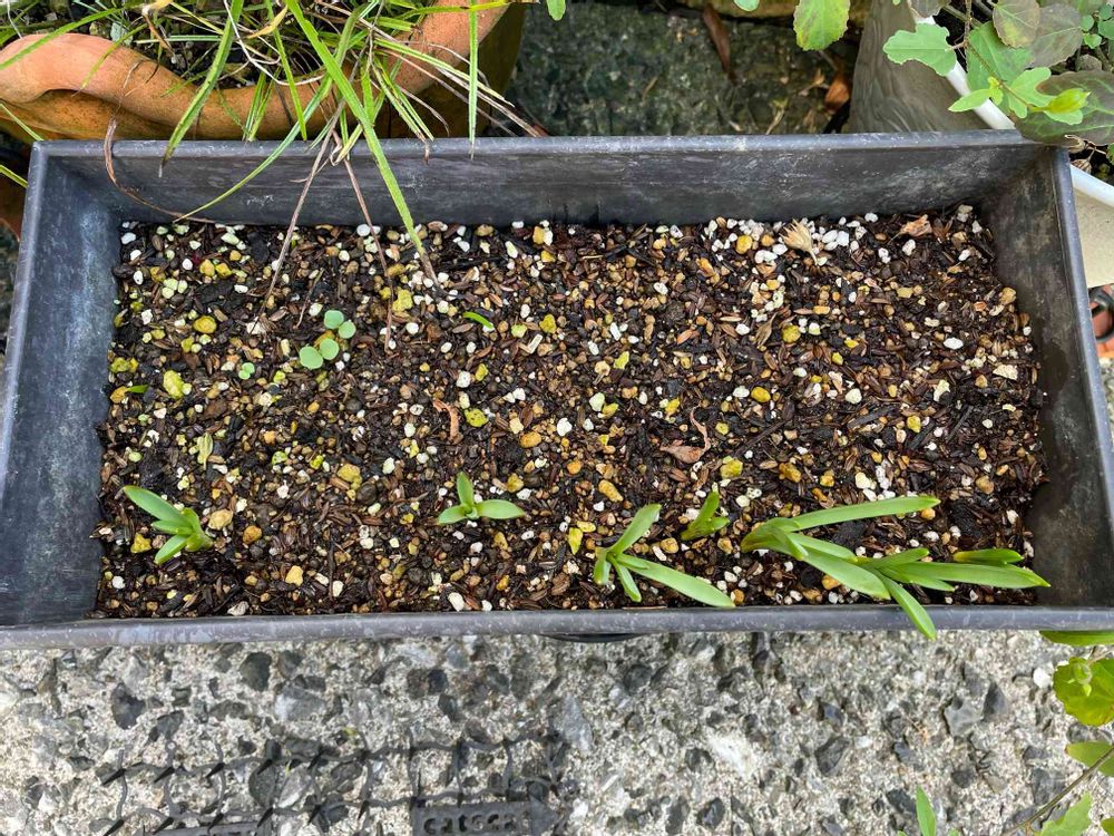 原種ハイビスカスロバツスの種が落ちてあちこちにで発芽してます。