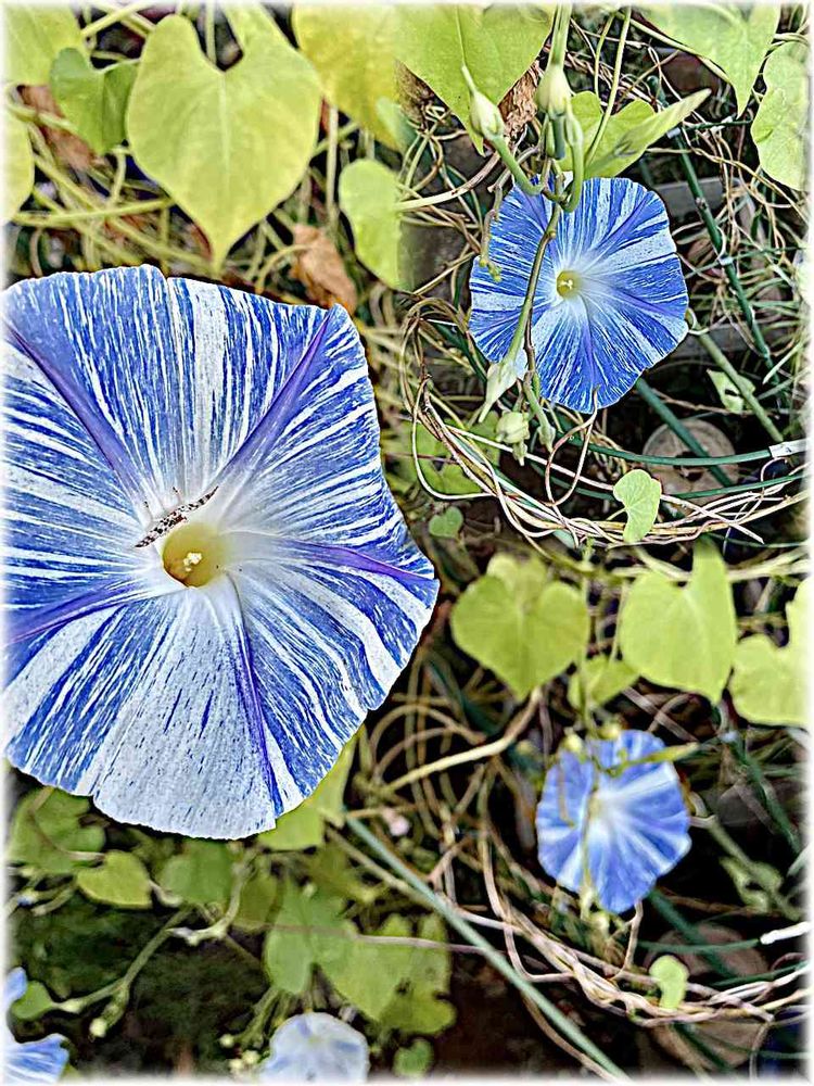 カタバミさんのお出かけ先,古色花壇に観る、白地に藍染絞りのような斑入り花,斑入りのアサガオ(朝顔)の投稿画像