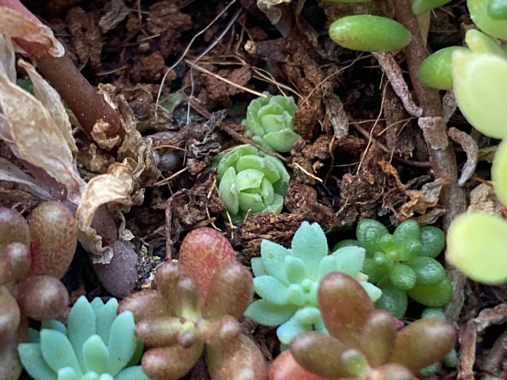 野良セダム鉢に小さなキャベツ…もしかして、ツルマンネングサの新芽⁉︎かわいい😍