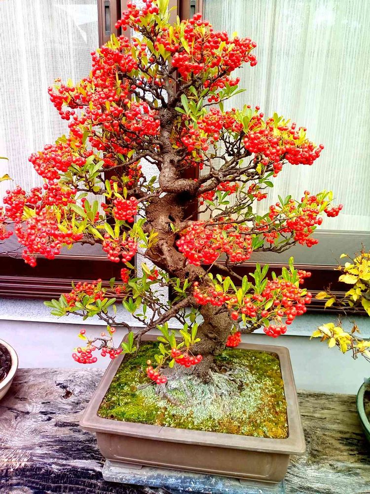 お庭に有る、盆栽仕立ての、ピラカンサスです。