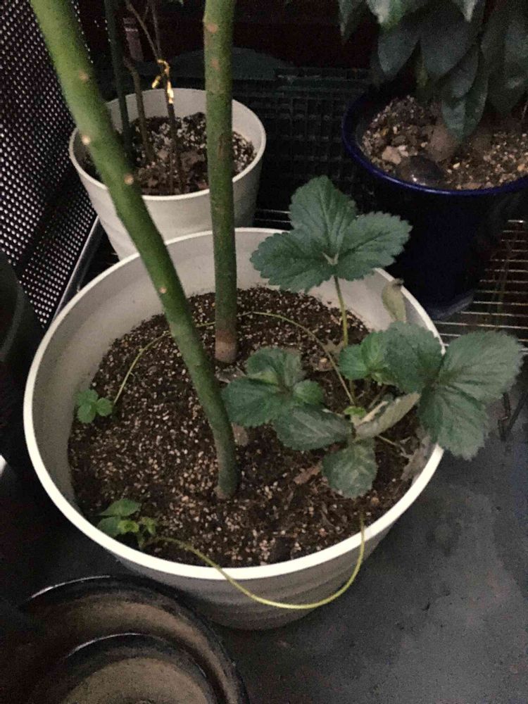 イチゴ(ロイヤルホームセンター産)がめっちゃ伸びました❗️ちなみに、さりげなくアボカド一緒の鉢に植え替えました。