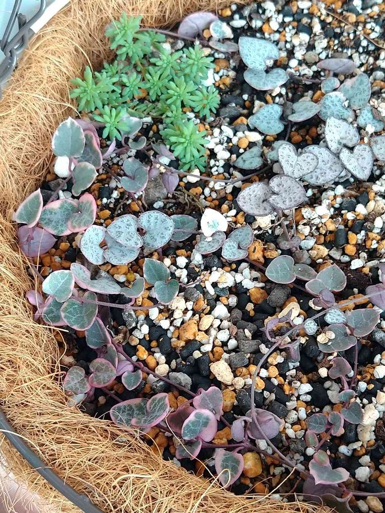 増えてほしくて大きめの吊り鉢に植え替えたハートカズラとレディハートです🥰💓