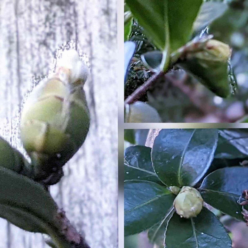 きれいに咲き出しているアプローチのピンクの山茶花に比べ、その少し離れたお隣とパーゴラの下の白い方の山茶花はまだまだの様です。左の写真、蕾に少し白が見えて来ているのはとても嬉しいです。