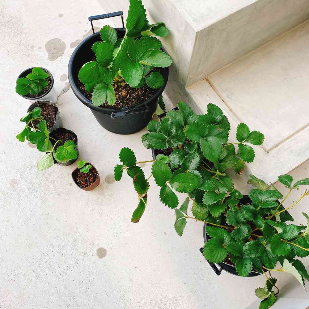 プチいちご狩りを堪能した親株(右下2つ)から大小5株孫がとれて、計7株になりました😳‼️