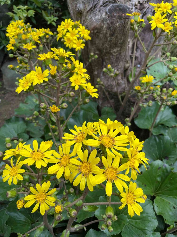庭で石蕗(ツワブキ)の花が良く咲いています😊ツヤツヤした葉っぱも可愛いですが😍花が咲くとまた違った景色になります✨