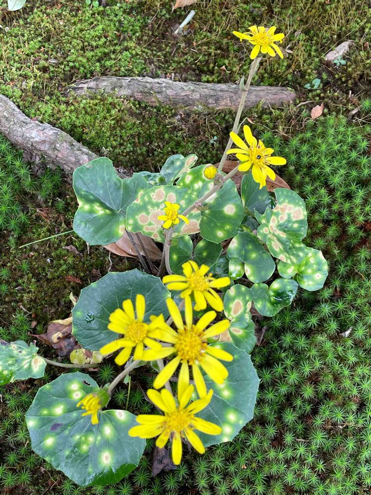 こちらも石蕗ですが🥰葉っぱに特徴があります😊少し小さめで花も少ないですが葉っぱの模様を引き立てています❣️花言葉「謙遜」「謙譲」そのものです
