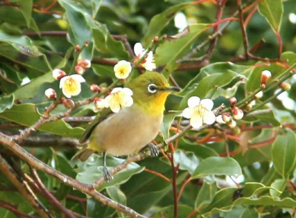 青空は入りませんでしたが、梅の花と花の間に「メジロ」👍