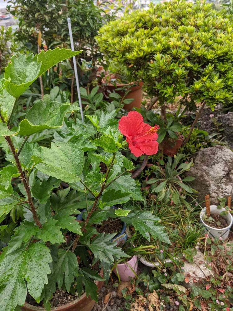 今朝のハイビスカス🌺咲きました。寒くなり始めたので、しばらくしたら、剪定して、部屋?か?置きざき考えなくては🤔年数が経って、株が太く!重い😱