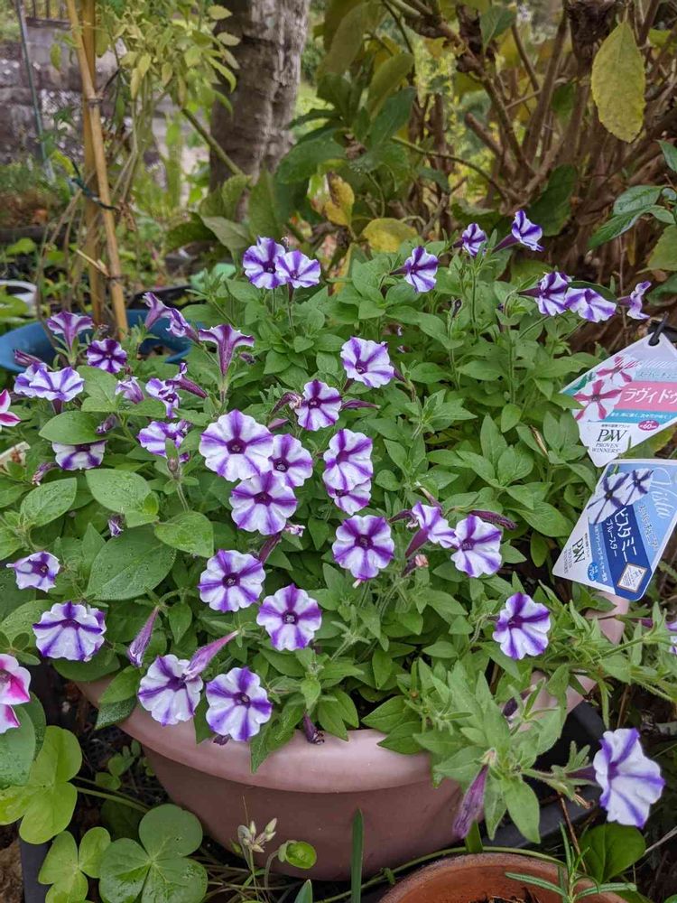 タグを見つけました。スパーペチュニア!スパーが、付いていましたね。だから、寒さにも少しは、強いのかなぁ?