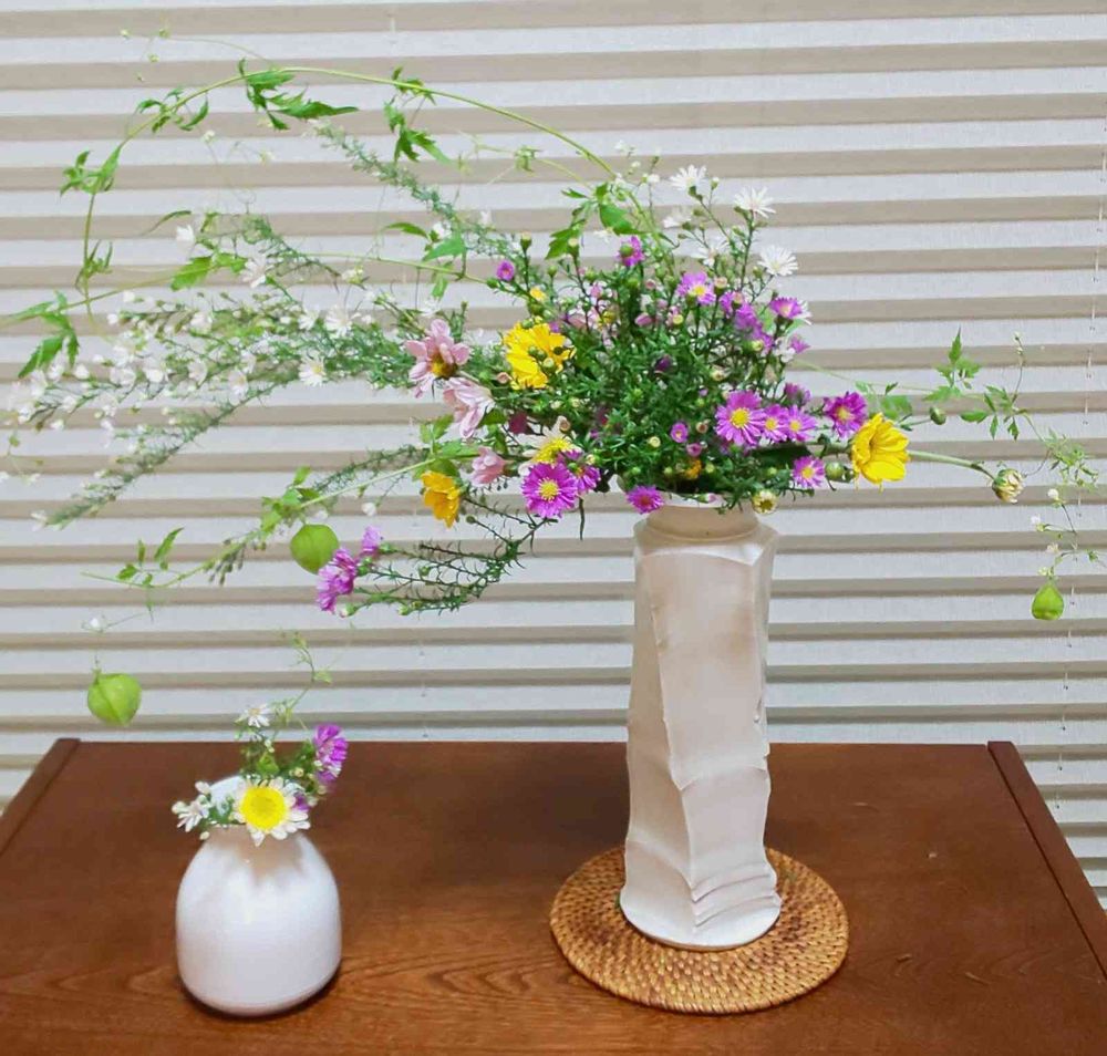 大きい方のアレンジのお花が実に自然な流れのように生けられていて、とても素敵です。フウセンカズラもいいアクセントになっていますね。