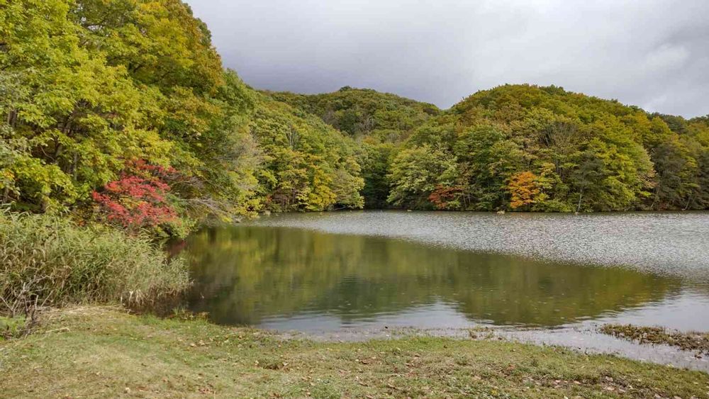 福島の裏磐梯の沼。鏡のように見えるはずが、時雨で風と小雨で湖面が揺れる!