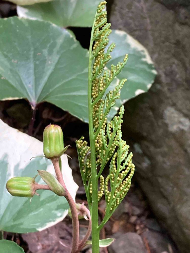 庭の目の届かないところに咲いていた、フユノハナワラビwithツワブキ。