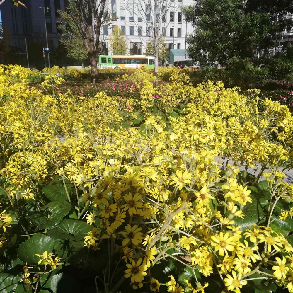 ツワブキの花というと、垣根越しにひっそりと咲く、ビタミンカラーの華やぎというイメージだったけど、これだけ沢山のツワブキが、都会のど真ん中に咲き誇る光景にびっくりしました☺
