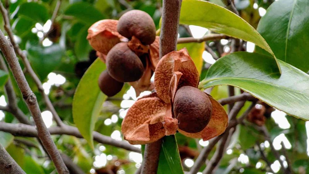 昨日の散歩🚶♀️。公園の椿、沢山の実が弾けてました。3つに分かれて開いて、中の種が見えてます😊