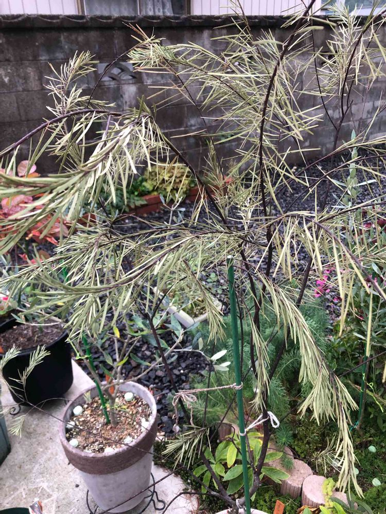 2月にお迎えしたアカシア スノーウィーリバー。夏過ぎから葉をいっぱい落として枯れた枝もちらほら。葉も元気がなくなってしまいました。このまま枯れてしまうのか?