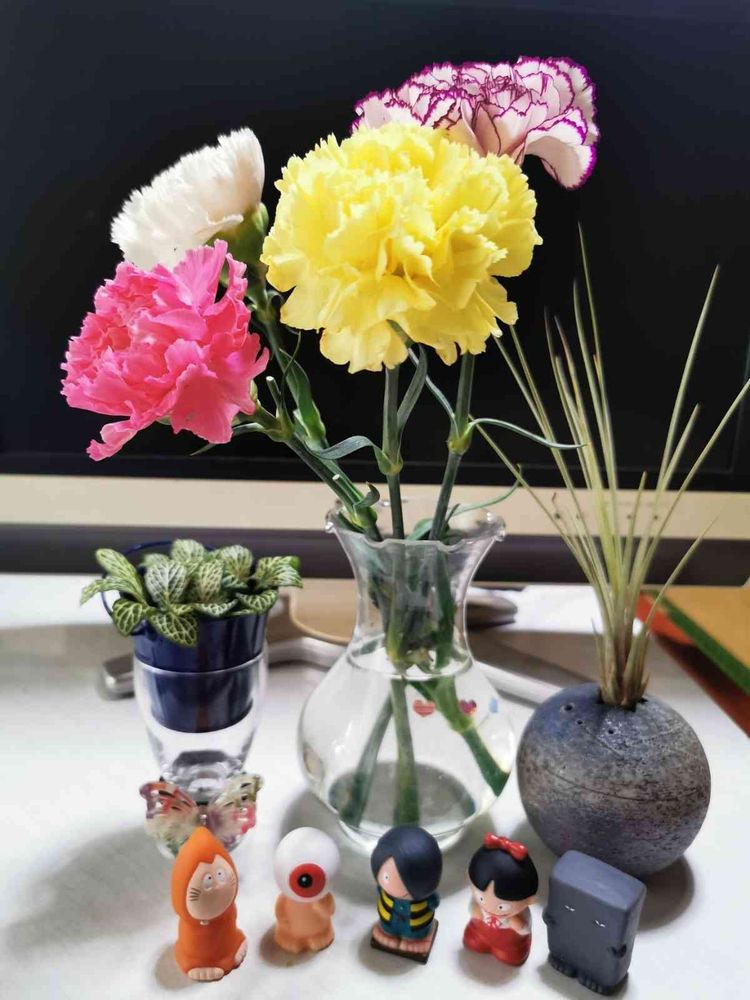 綺麗な色のカーネーションを買ったけど、それだけでは、寂しいので、鬼太郎たちに参加してもらいました。🤭