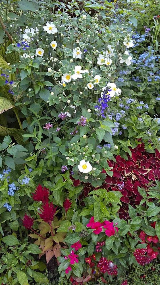 真紅、ピンク、水色、青色(紫⁉️)色々な花の蕾たちですが、秋明菊以外の花名が分かりません😰💦