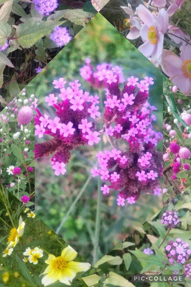 中央バーベナ-ポナリエシス(サンジャクバーベナ)、秋明菊、ウインターコスモス左上と右下は不明,😃💐💕