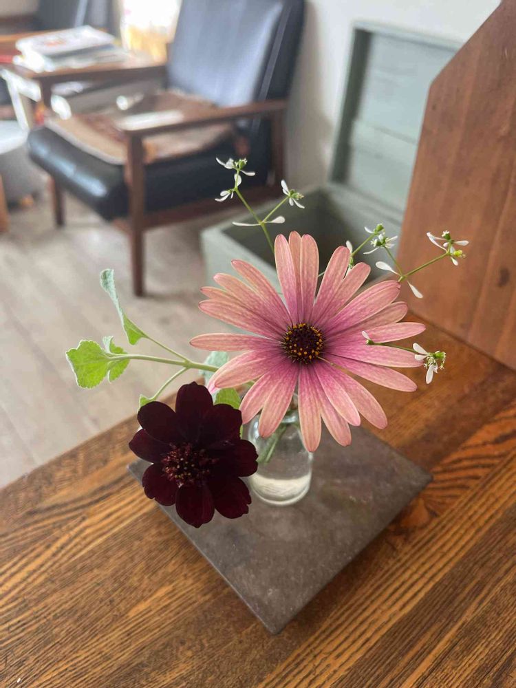 チョコレートコスモスがほんとにチョコの香りがするのを最近知りました。今まで色だけでついた名前だと思ってたので大きな発見です🌼