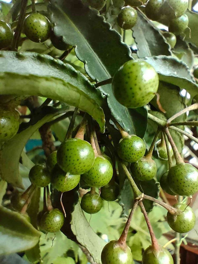 万両の実、青いうちは斑点があるんですねぇ。