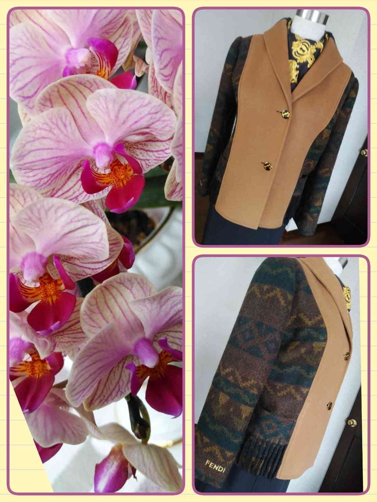 ジャケットは 息子のカシミアコートをサステナブル(再生)しました👔。前後の身頃のみ使用し お袖と切り替えにはFENDIの大判スールを使用ております。風合いや色合いがピッタリだったので これもサステナブルですね😄