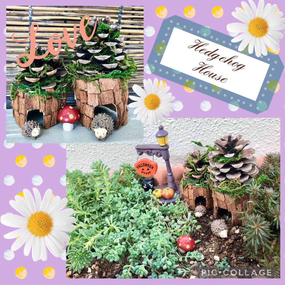 ハリネズミ達🦔に小さなお家を作りました🍄屋根は、拾ってきたまつぼっくり🦔