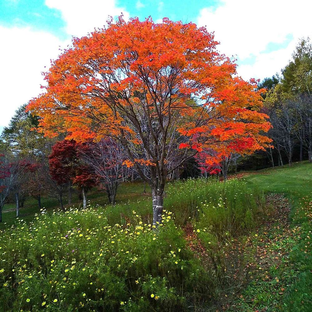 青いお空と、キバナコスモスさんと、赤いモミジさんのコントラストが美し過ぎます🤩😍✨💙💛❤️