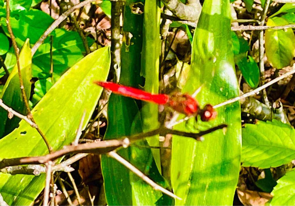 鮮やかな真っ赤な色のトンボが、飛んできて木の枝にとまりたした