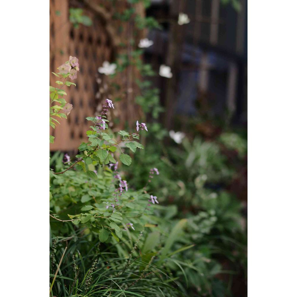 チャイニーズハットの花の残骸とバックにパルセット(クレマチス)に昨日ツイートしたオルトシフォン ラビアッツ!!