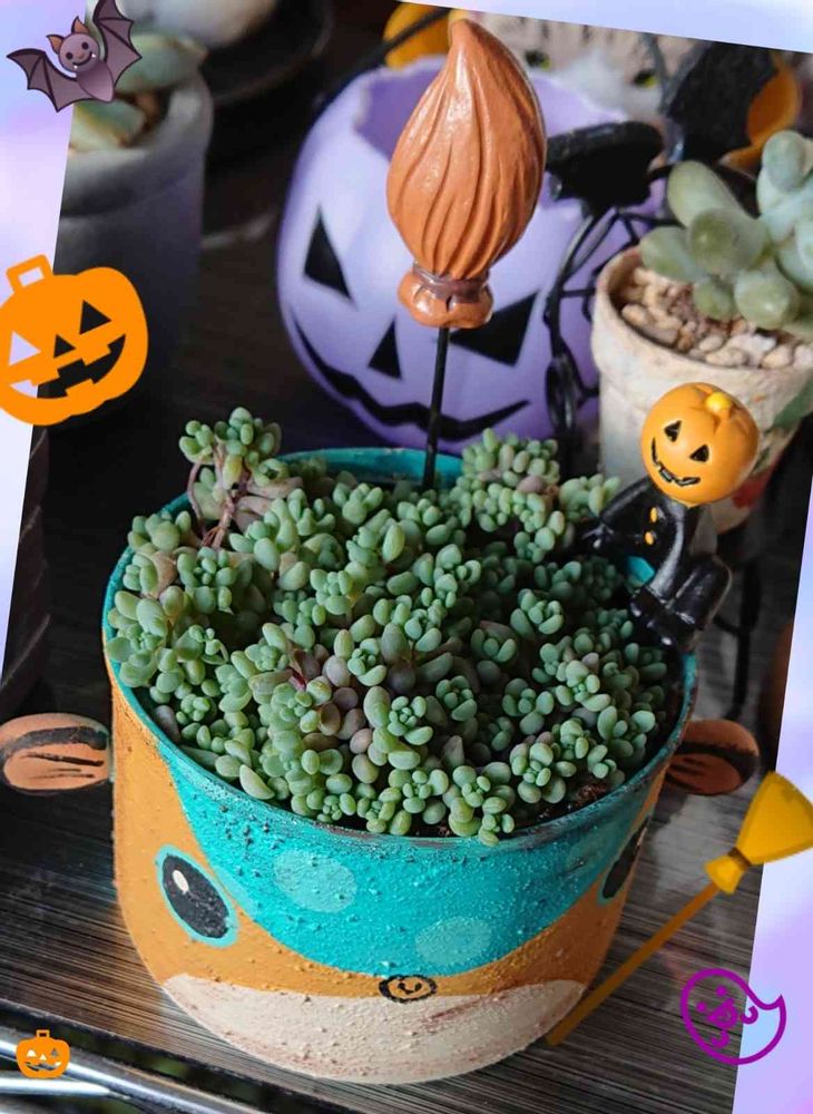 おはようございます🎵サニコさんのリメ缶にセダム植え替えました❤️モリモリになるのを期待して~🤗またハロウィンっぽくしてみました😁